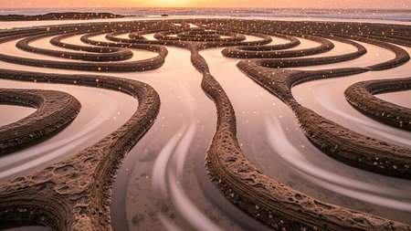 Stone labyrinth on a beach at sunset with sparkling water and glowing lights reflecting.
