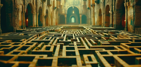 Top view of a stone maze with winding, complex pathways, seen from the air, evoking mystery and challenge.