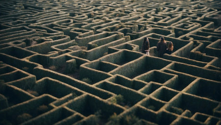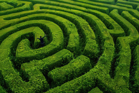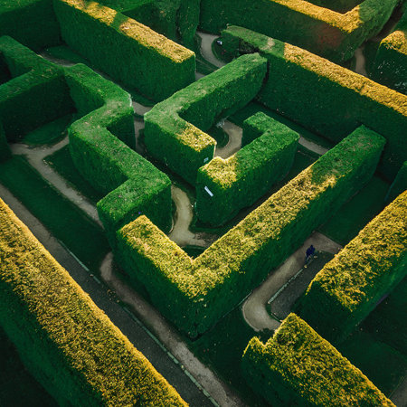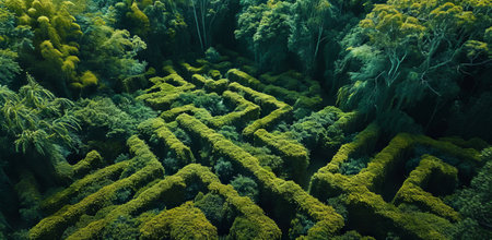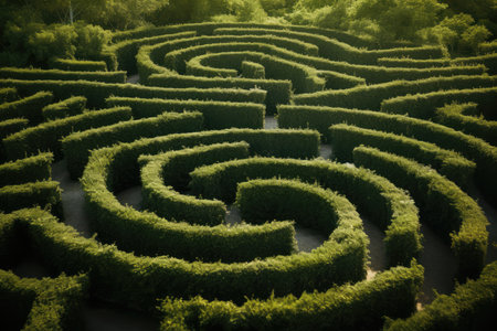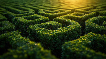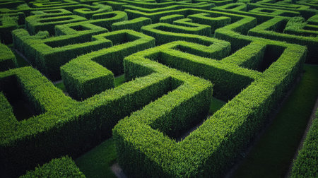 A hedge maze with complex paths and corners, testing the viewer sense of direction AI generated