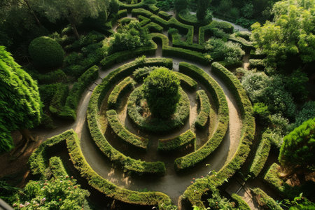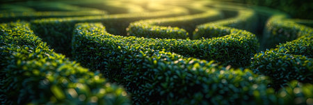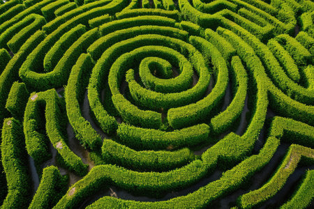 Closeup of a green labyrinth, dense hedges forming intricate circular patterns, vibrant greenery
