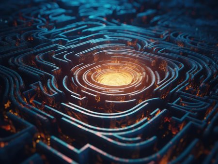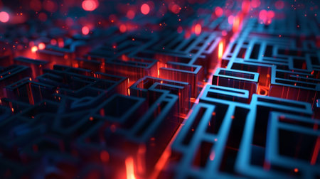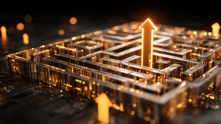 Explore an intricate abstract maze design illuminated by glowing arrows. This image symbolizes progress and innovation, perfect for technology and business themes.