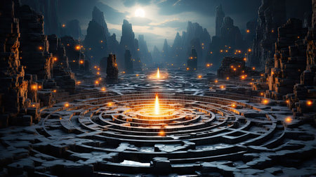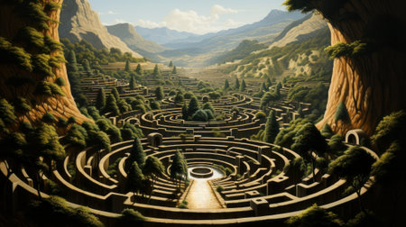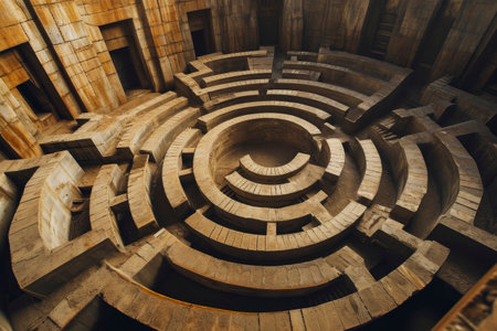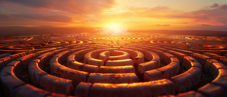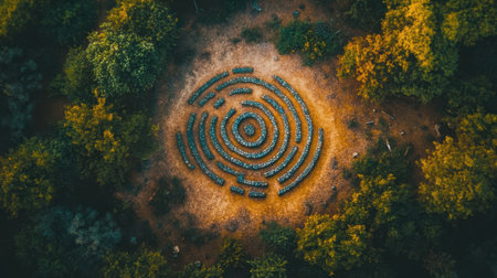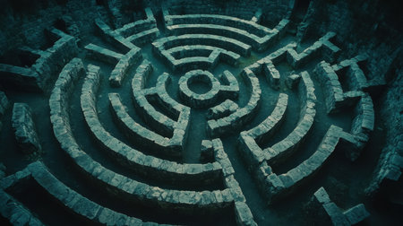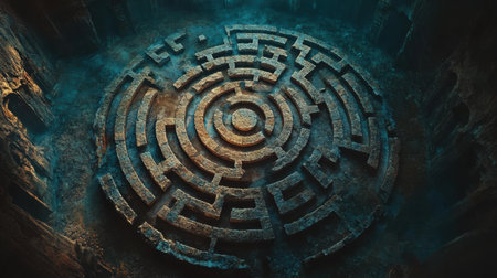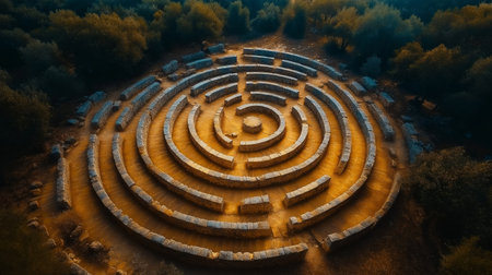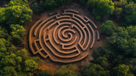 Aerial View of a Complex Circular Labyrinth Made of Stone, Symbolizing Challenge and Strategy