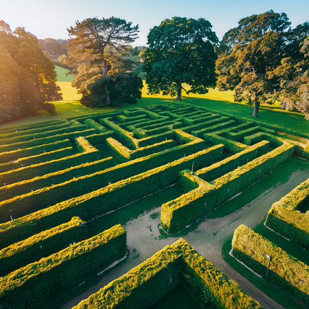 Aerial view of a sprawling green hedge maze, with intricate twists and turns, offering a mesmerizing challenge.