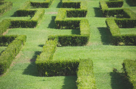 Green labyrinth in garden geometrical symmetry maze Aerial drone view
