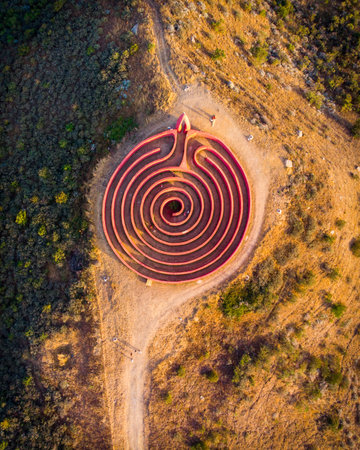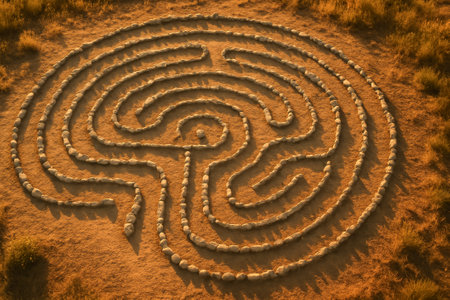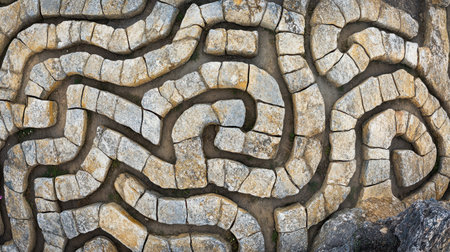 Intricate stone maze captured in an aerial view, with its winding paths creating a sense of mystery and intrigue.