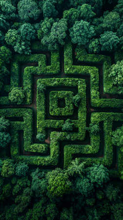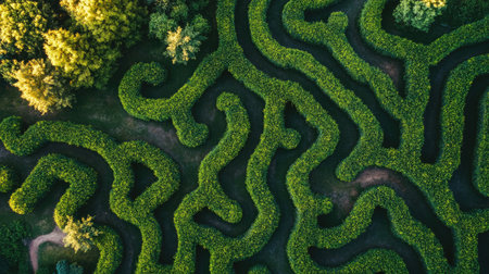 Aerial view of a lush, green labyrinth in a vibrant park, intricate pathways, and dense foliage