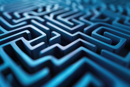 A detailed view of a complex maze pattern, featuring shades of blue, with intricate pathways and intersections, A maze representing the complexity of cybersecurity, AI Generated