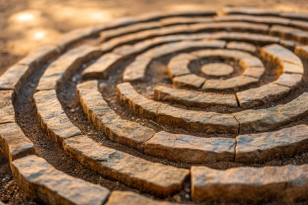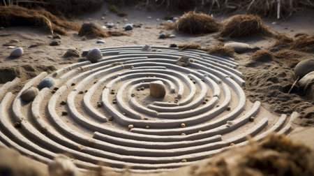 a sand spiral created with stones and pebbles, forming a captivating spiritual landscape. this atmospheric installation showcases a grid-based design, incorporating warmcore elements and a raw vulnerability. the playful use of perspective adds depth to the esoteric iconography present in the artwork. ai generated