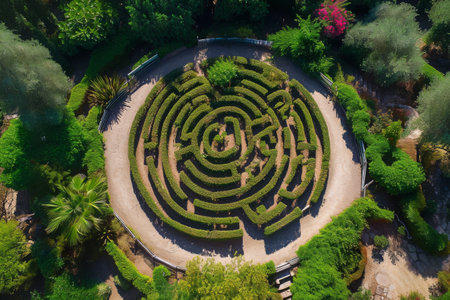 Explore the intricate pathways of a green maze culminating in a circular center, Ai Generated.