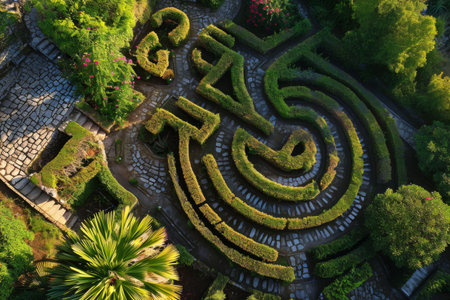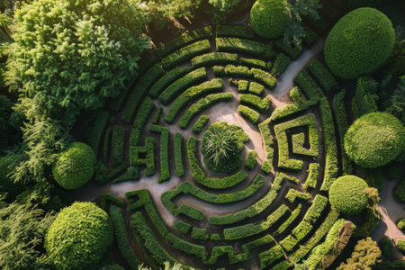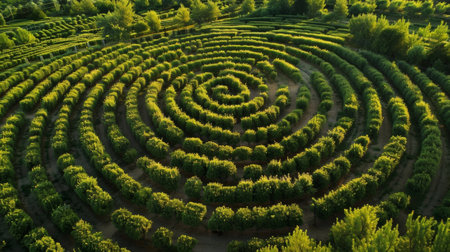 aerial view of a hedge maze at sunset, intricate garden paths. nature and exploration concept
