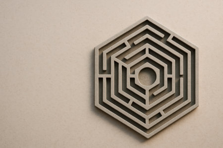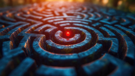 A maze made from stone blocks with a glowing red dot in the center, symbolizing challenge, direction, and the search for solutions or goals.