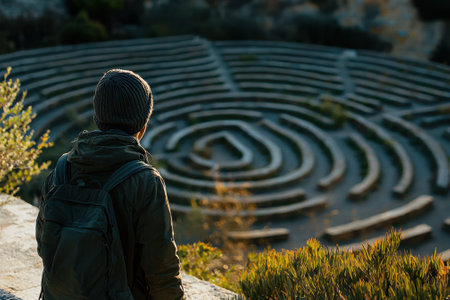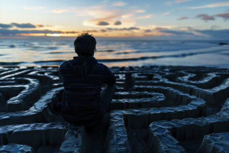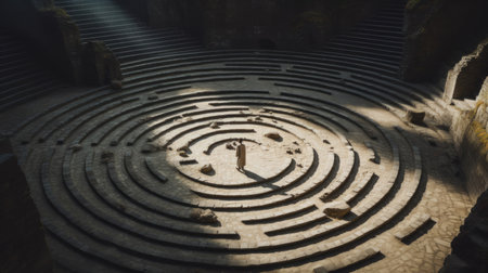 Contemplative philosopher at labyrinth center high-angle soft light illumination