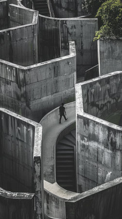 A man is walking down a spiral staircase in a concrete structure. Concept of mystery and intrigue, as the man is navigating through a maze-like environment