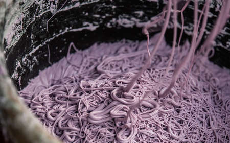 Close up view of traditional chinese noodles being made on the food stall in Chongqing old town, China