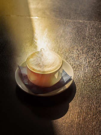White cup of coffee on wooden table in the coffee shop.
