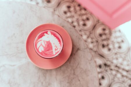 trendy beetroot latte with latte art and flower petals
