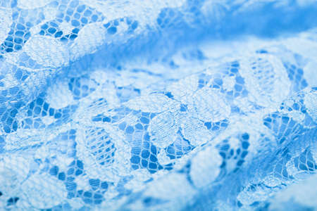 A stunning view of delicate blue lace fabric draped elegantly on a smooth surface. This soft, sheer textile adds a touch of sophistication and charm to any design.