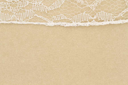 Delicate lace textured material on beige paper background with copy space for message or use as a texture