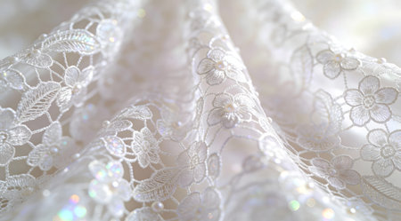 An AI generated illustration of Closeup view of white lace fabric draped on a flat surface