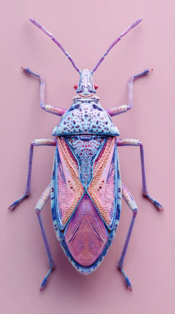 Detailed macro shot of a vibrant insect, showcasing intricate patterns and colors against a soft pink backdrop.