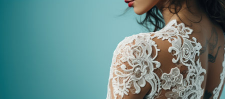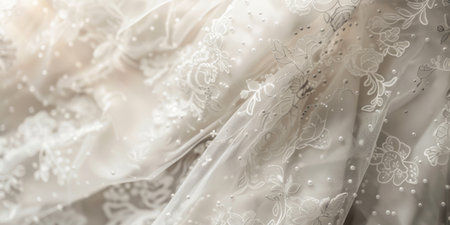 Close up view of lacework on a white wedding dress highlighting elegant floral designs, creating a romantic atmosphere for special ceremonies