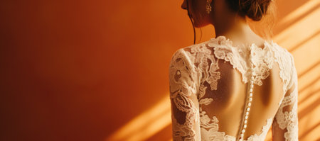 This stunning bridal gown features intricate lace detailing, beautifully illuminated by soft natural light, creating a romantic and dreamy ambiance.