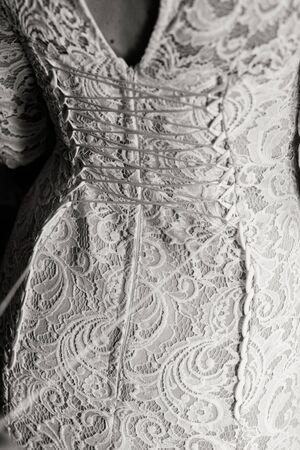 Close up view showcases the delicate lace details of a white wedding dress perfect for romantic ceremonies and special moments.