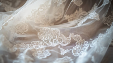 Delicate lace fabric adorned with floral embroidery displayed in soft natural light enhancing its intricate details. Generative AI