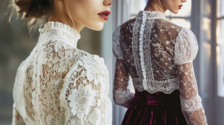 A classic lace blouse paired with a structured velvet skirt creates a timeless and sophisticated look with a vintage twist