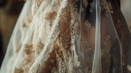 Elegant close-up of intricately embellished fabric showcasing delicate textures and shimmering details in soft lighting Generative AI