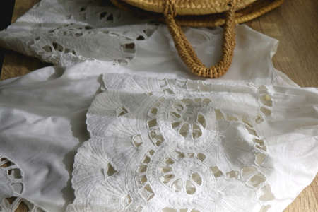 White linen lace blouse and round straw bag on wooden background. Selective focus.