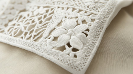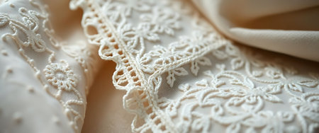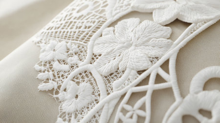 This image showcases exquisite lace edging on a creamy fabric, highlighting its intricate details and elegant design, perfect for decorations and style inspiration.