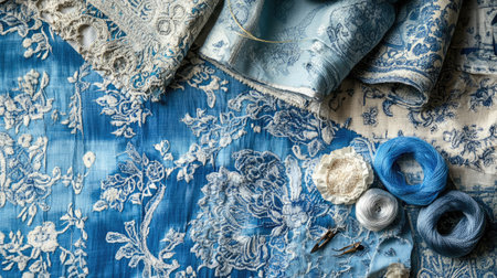 Discover a beautiful arrangement of blue textiles and embroidery materials. Perfect for crafting, sewing, or interior design inspiration. Enjoy the rich textures!
