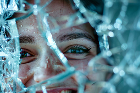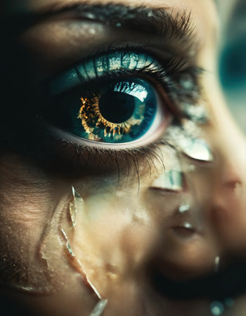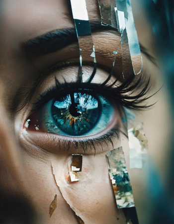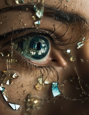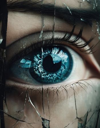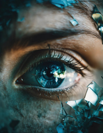 Detailed view of an eye seen through shattered glass, conveying a sense of fragility and vulnerability