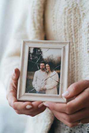 In a moment of raw vulnerability, a person grasps a shattered photo frame tightly, holding a once-happy picture of a couple embraced in joy. The broken glass reflects the anguish of infidelity and shattered trust, emblematic of love lost amidst the chaos of betrayal. Set in a softly lit indoor environment, the hands reveal an emotional struggle as they present this poignant reminder of better days, evoking feelings of nostalgia and heartache intertwined with hope for healing.