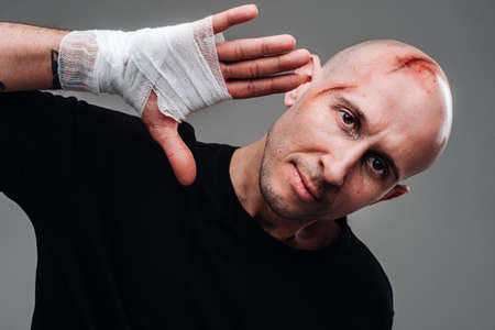 A battered man with a bandaged head and a cast on his arm stands on a gray background.