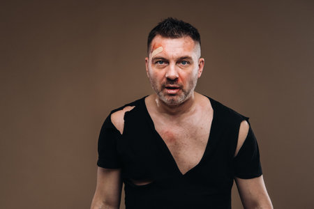 Against a gray background stands a battered angry man in a black T-shirt with wounds.