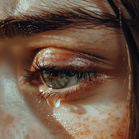 A dramatic close-up of an eye expressing emotional distress, captured with a shallow depth of field. The image highlights the texture and detail, evoking a sense of urgency and realism.