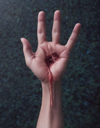 A hand is extended with a deep, bleeding wound in the palm, reminiscent of stigmata. The somber mood is highlighted by the blurred green background.