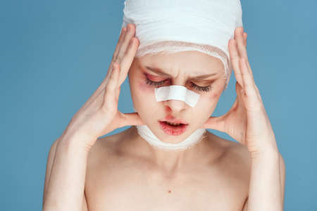 portrait of woman after plastic surgery with bandage on face