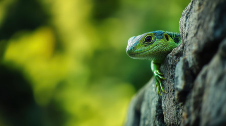 A stunning green lizard peers from a rocky surface, set against a softly blurred background of lush greenery, showcasing the beauty of wildlife.