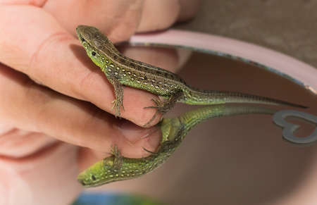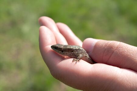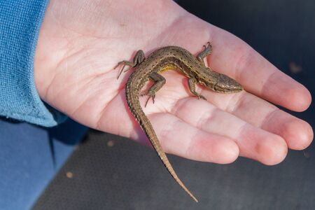 Close-up of an european common lizard in hand. Darevskia praticola.
