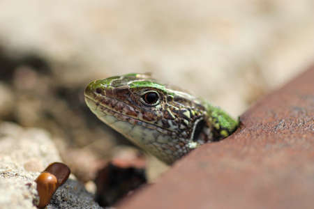 Sand lizard, Lacerta agilis, closeup of the reptile