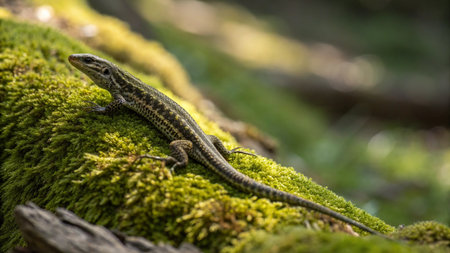 Lizard sitting on a mossy surface with a blurred background