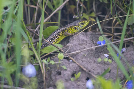European green lizard with blue and yellow body color on bright grass background