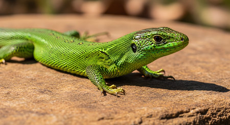 A bright green lizard with black spots rests on a flat brown rock basking in the sun. The reptiles scales and eye are sharp and detailed against the blurred natural background. This macro shot highlights the beauty of cold-blooded wildlife.
