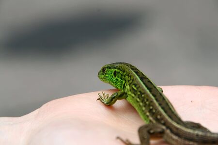 green lizard in hand. green lizard in the child's hand close-up, green lizard. Green lizard in the hands of a child. Lizard on hand, small green lacerta agilis sitting on a child's hand.