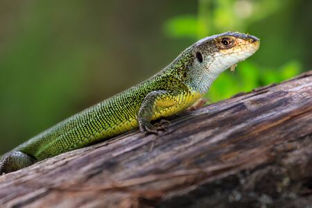 green forest spotted lizard on a wooden stump, lurking in the jungle, basking in the sun.