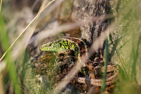 Green sand lizard (Lacerta agilis) hiding in the grass