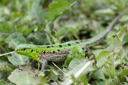 Green lizard (Lacerta agilis) sitting in the grass in garden